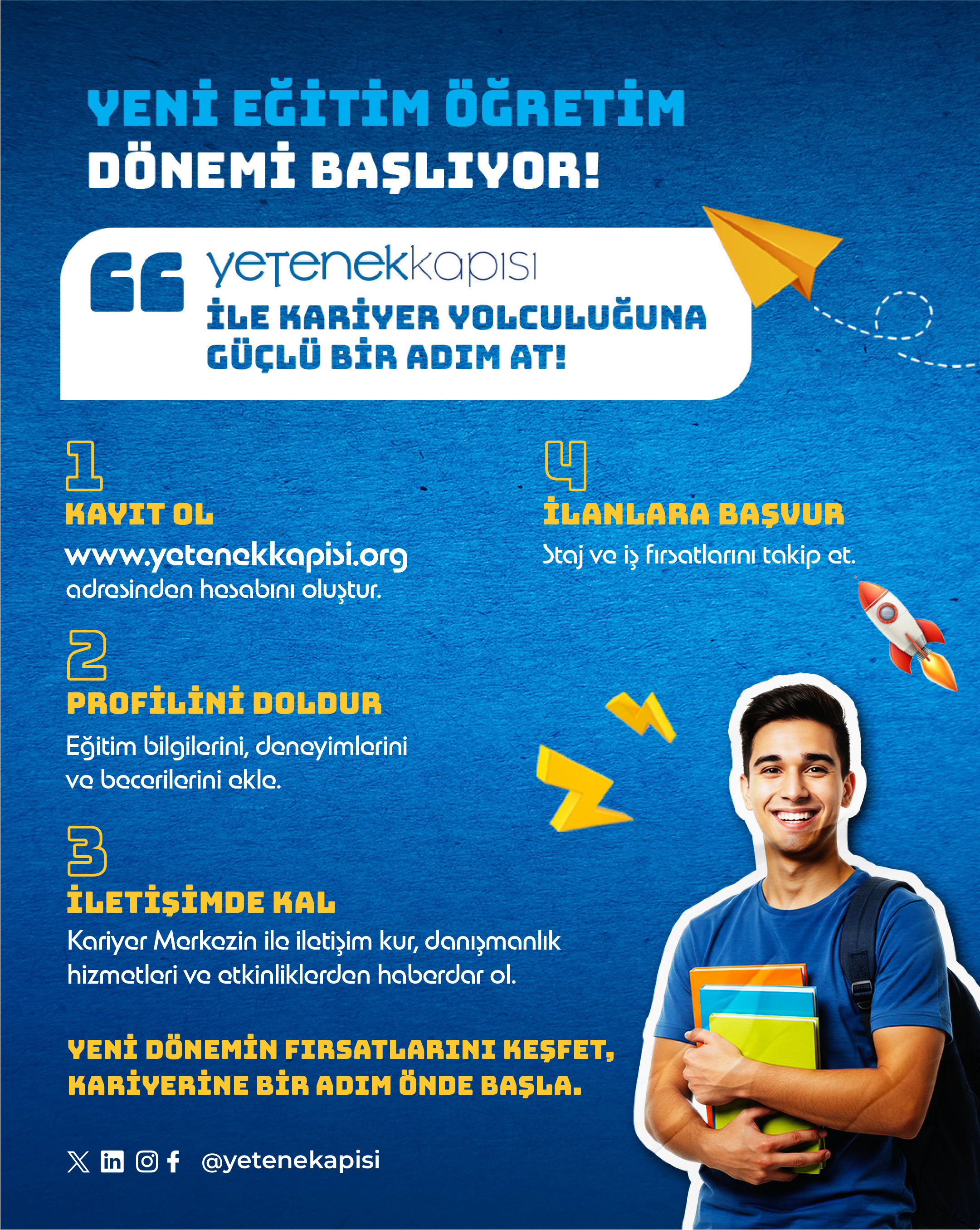Genç üniversiteli! #YetenekKapısı ile kariyer etkinliklerinden haberdar olabilir, danışmanlık hizmetinden faydalanabilir, iş/staj ilanlarını takip edebilirsin. Profilini oluşturmaya hemen başla.