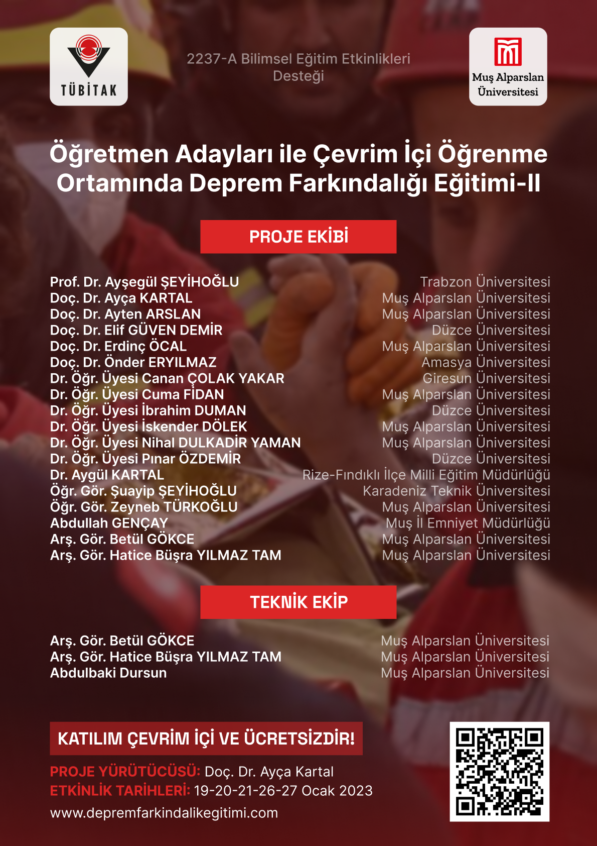 Öğretmen Adayları ile Çevrim İçi Öğrenme Ortamında Deprem Farkındalığı Eğitimi-II etkinliğinde öğretmen adaylarına deprem farkındalığı eğitiminde dijital yaklaşımın önemine yönelik farkındalık kazandırmak ve Web 2.0 destekli etkinlik tasarlama becerisi kazandırmak hedeflenmektedir. Bu çerçevede farklı disiplinler için ortak tema olan deprem konusunda öğretmen adaylarının bilgi ve deneyimlerinin de artırılması amaçlanmıştır. Proje 19-20-21-26-27 Ocak 2024 Muş Alparslan Üniversitesi Eğitim Fakültesinde (Çevrim içi) gerçekleştirilecektir.