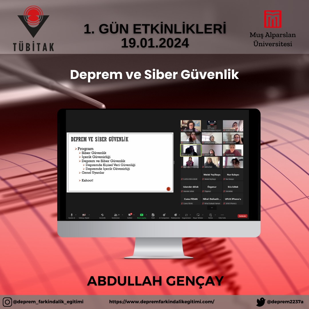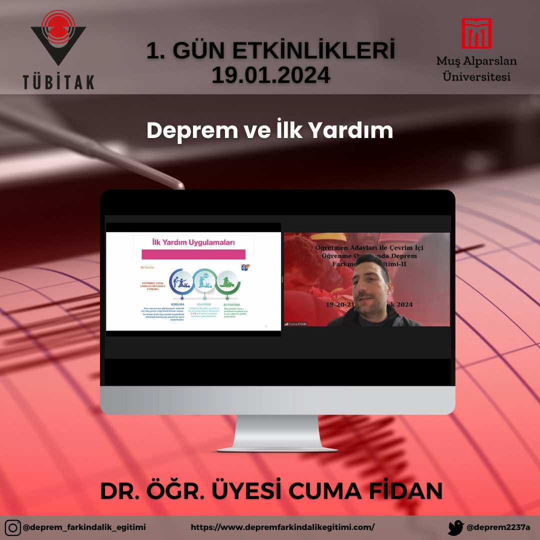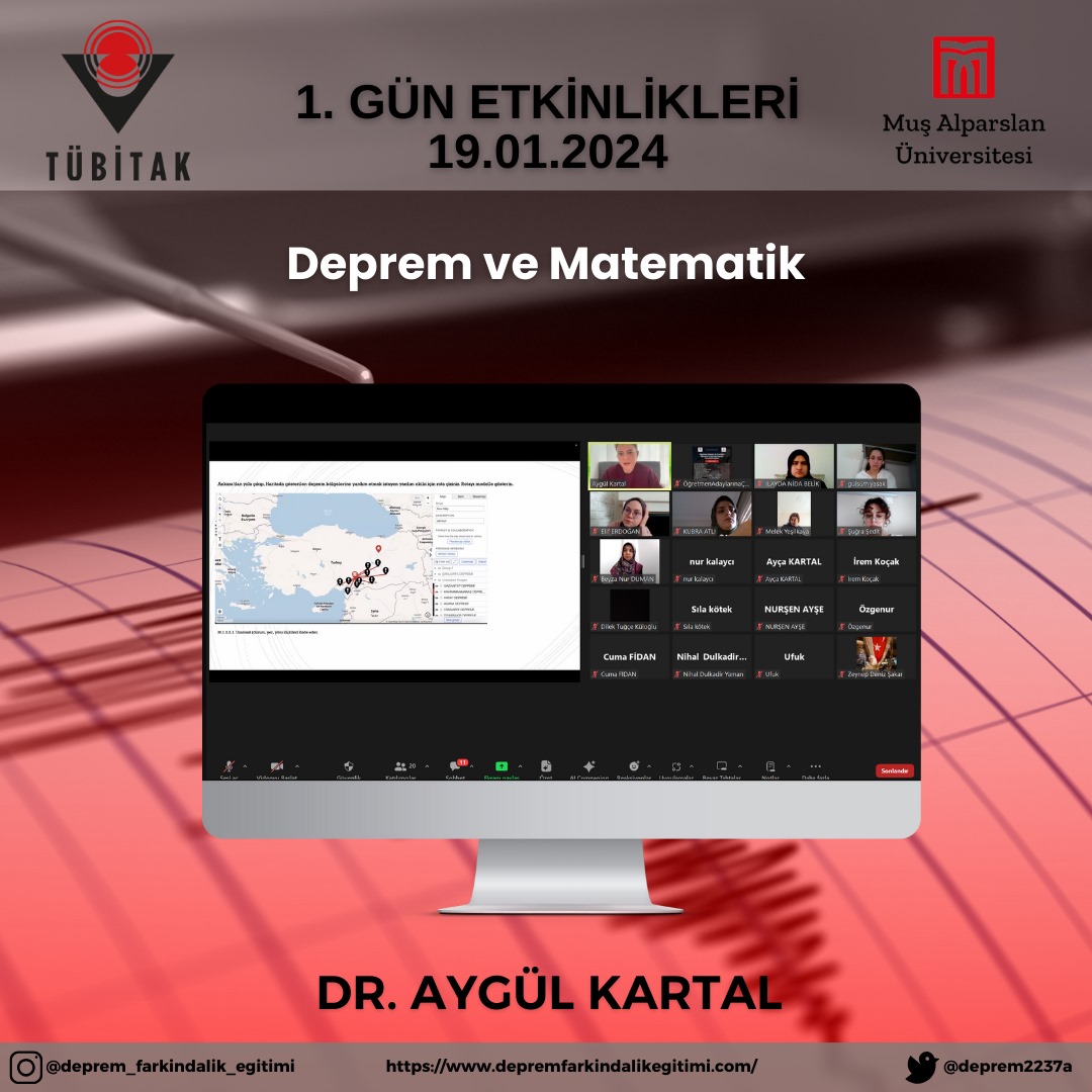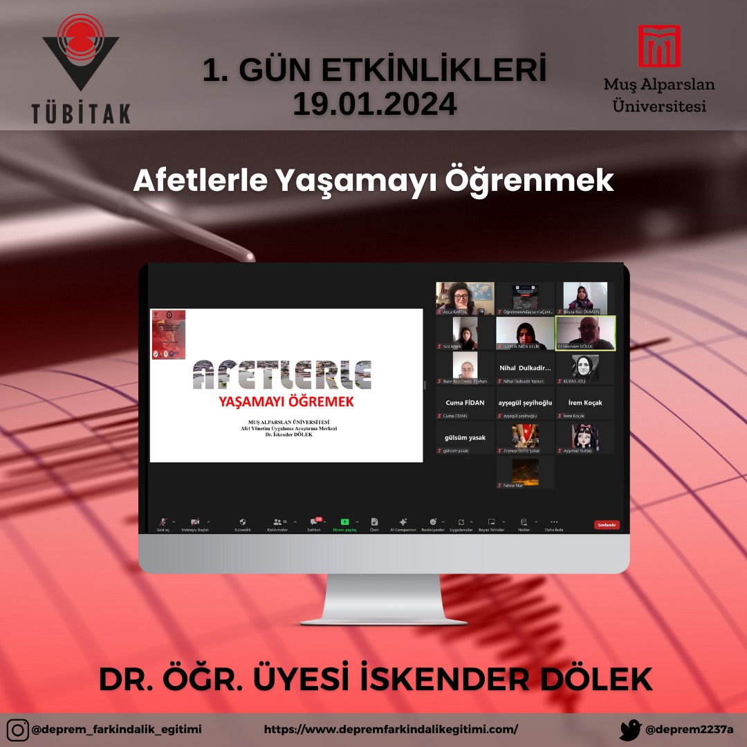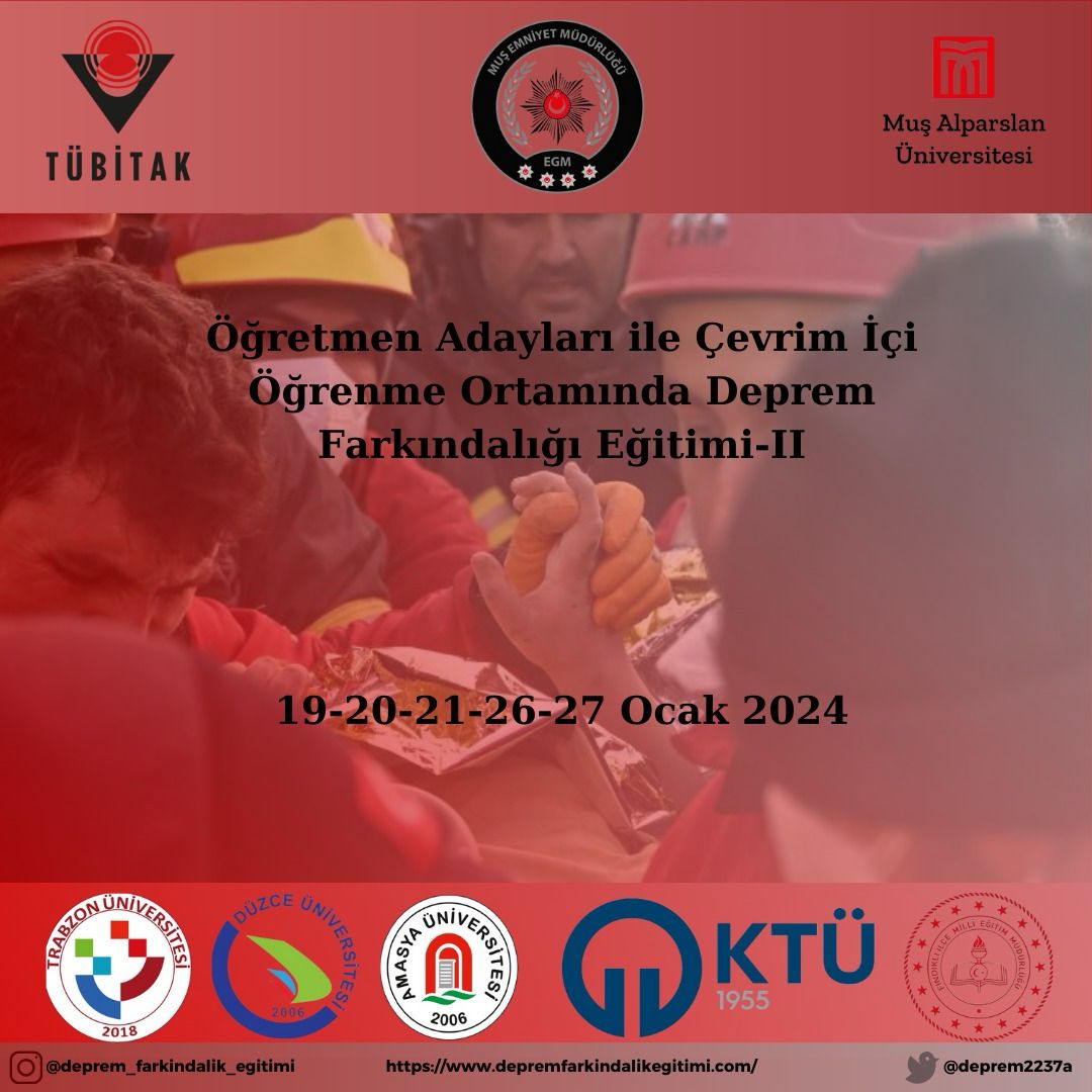Yürütücülüğünü Eğitim Fakültesi Temel Eğitimi Bölümü Sınıf Eğitimi ABD öğretim üyesi Doç.Dr. Ayça KARTAL’ın yaptığı, TÜBİTAK 2237-A Bilimsel Eğitim Etkinlikleri Desteği kapsamında ikinci kez desteklenmeye layık görülen “Öğretmen Adayları ile Çevrim İçi Öğrenme Ortamında Deprem Farkındalığı Eğitimi-II” etkinlikleri başarıyla tamamlandı. Öğretmen Adayları ile Çevrim İçi Öğrenme Ortamında Deprem Farkındalığı Eğitimi-II etkinliğinde öğretmen adaylarına deprem farkındalığı eğitiminde dijital yaklaşımın önemine yönelik farkındalık kazandırmak ve Web 2.0 destekli etkinlik tasarlama becerisi kazandırmak hedeflenmiştir. Bu çerçevede farklı disiplinler için ortak tema olan deprem konusunda öğretmen adaylarının bilgi ve deneyimlerinin de artırılması amaçlanmıştır. Projeye MUŞ ALPARSLAN Ü. SÜLEYMAN DEMİREL Ü., KAHRAMANMARAŞ SÜTÇÜ İMAM Ü., KİLİS 7 ARALIK Ü., ONDOKUZ MAYIS Ü., GİRESUN Ü., DÜZCE Ü., RECEP TAYYİP ERDOĞAN Ü., KTO KARATAY Ü. olmak üzere 9 farklı üniversiteden 33 öğretmen adayı katılım göstermiştir. Muş Alparslan Üniversitesi ile birlikte Trabzon Üniversitesi, Düzce Üniversitesi, Amasya Üniversitesi, Giresun Üniversitesi, Karadeniz Teknik Üniversitesi, Muş İl Emniyet Müdürlüğü ve Rize-Fındıklı İlçe Milli Eğitim Müdürlüğü’nün yer aldığı projede Sınıf Öğretmeni, Sosyal Bilgiler Öğretmeni ve Fen Bilgisi Öğretmen adaylarına çevrim içi deprem farkındalığı eğitimi verilmiştir. Yürütücülüğünü Doç. Dr. Ayça KARTAL’ın yaptığı etkinlikte Muş Alparslan Üniversitesi Eğitim Fakültesi’nden Doç. Dr. Ayten ARSLAN, Doç. Dr. Erdinç ÖCAL, Dr. Öğr. Üyesi İskender DÖLEK, Arş. Gör. Betül GÖKCE, Arş. Gör. Hatice Büşra YILMAZ TAM, Öğr. Gör. Zeyneb TÜRKOĞLU; Sağlık Bilimleri Fakültesi’nden Dr. Öğr. Üyesi Cuma FİDAN; Uygulamalı Bilimler Fakültesi’nden Dr. Öğr. Üyesi Nihal DULKADİR YAMAN, Muş İl Emniyet Müdürlüğü’nden Şube Müdürü Abdullah GENÇAY; Trabzon Üniversitesi Eğitim Fakültesi’nden Prof. Dr. Ayşegül ŞEYİHOĞLU, Düzce Üniversitesi Eğitim Fakültesi’nden Doç. Dr. Elif GÜVEN DEMİR, Dr. Öğr. Üyesi Pınar ÖZDEMİR, Dr. Öğr. Üyesi İbrahim DUMAN, Amasya Üniversitesi’nden Doç. Dr. Önder ERYILMAZ, Giresun Üniversitesi’nden Canan ÇOLAK YAKAR, Karadeniz Teknik Üniversitesi’nden Şuayip ŞEYİHOĞLU ve Rize Fındıklı Çağlayan Osman Hacıalioğlu Ortaokulu’ndan Dr. Aygül KARTAL yer almıştır. Daha fazla bilgi için https://www.depremfarkindalikegitimi.com adresini ziyaret edebilirsiniz.