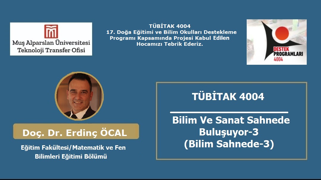 Fakültemiz Matematik ve Fen Bilimleri Bölümü Fen Bilgisi Eğitimi Anabilim Dalı öğretim üyesi Doç. Dr. Erdinç ÖCAL'ın yürütücülüğünü üstlendiği “Bilim ve Sanat Sahnede Buluşuyor-3” başlıklı proje TÜBİTAK 4004 Doğa Eğitimi ve Bilim Okulları Destekleme Programı kapsamında finanse edilmeye hak kazanmıştır.